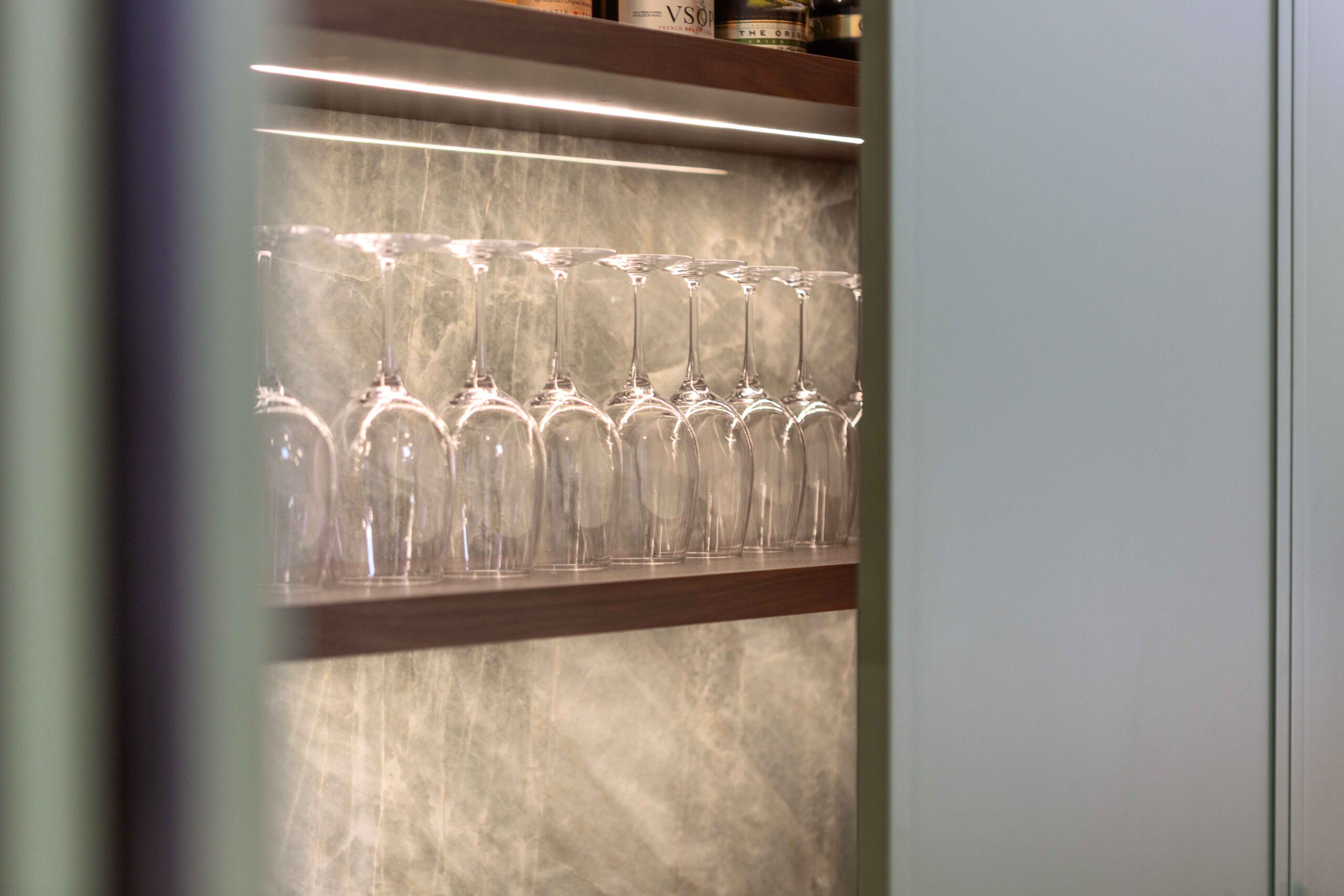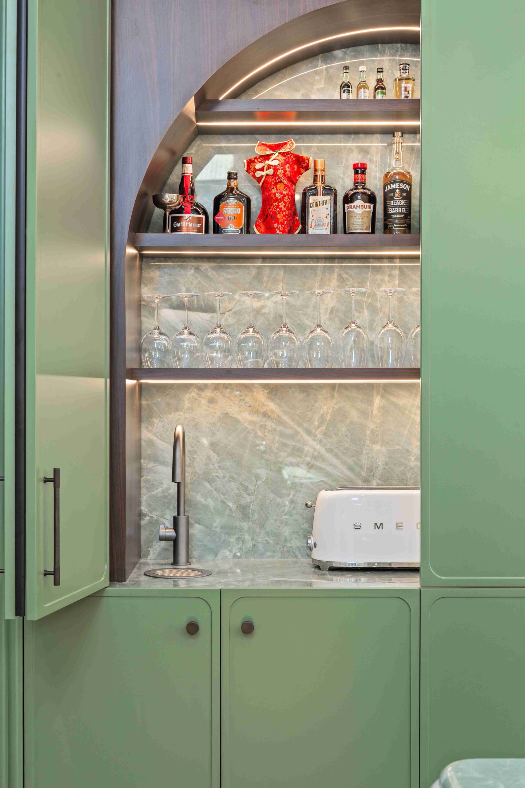 Momo handles by Castella in a solid bronze finish complement the cabinetry tones and stone, reinforcing the home’s timeless character. In the bar area, a custom-made arch with pocket doors becomes a standout feature, enhanced by discreet recessed LED strip lighting that highlights the craftsmanship while adding ambient warmth.