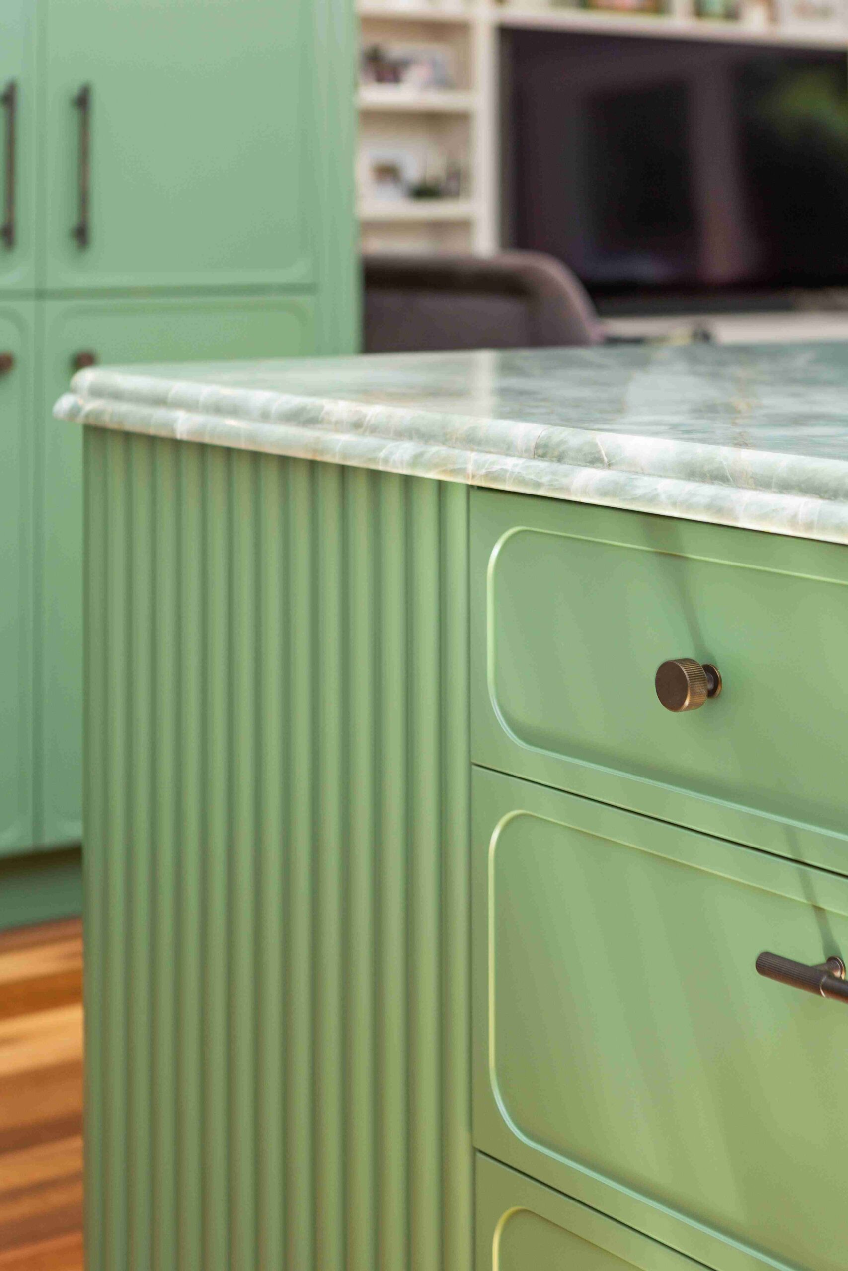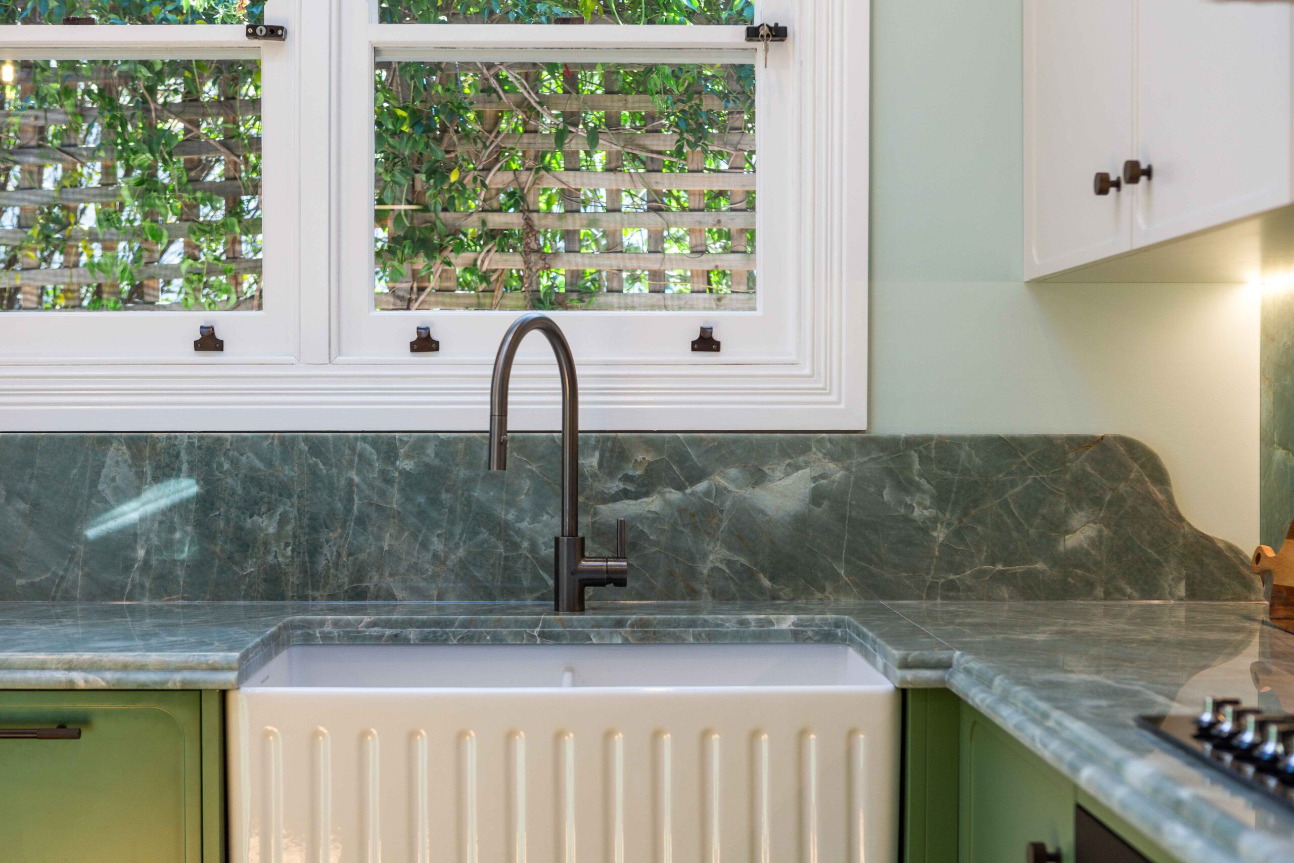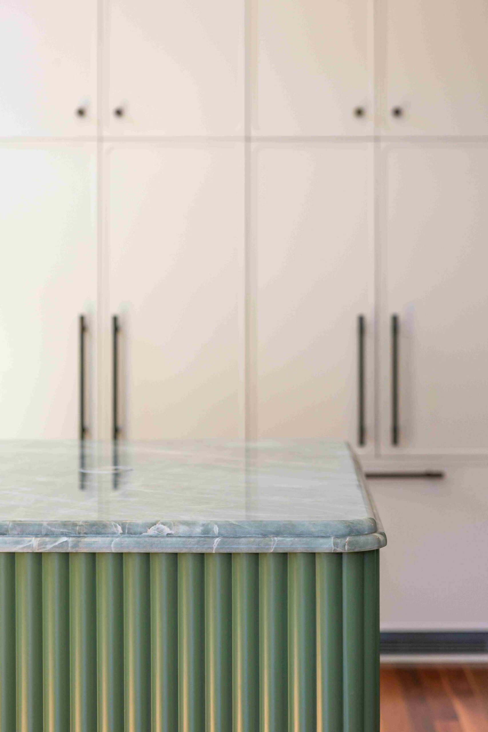 This bespoke kitchen features a custom shaker profile with a modern twist, softened through elegant curves and radius corners that subtly reinterpret a classic style. Designed to sit comfortably within a Federation home, the cabinetry balances heritage influence with contemporary execution.