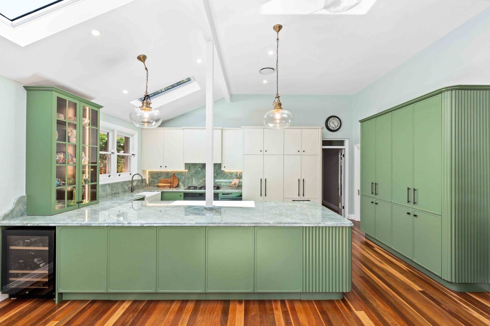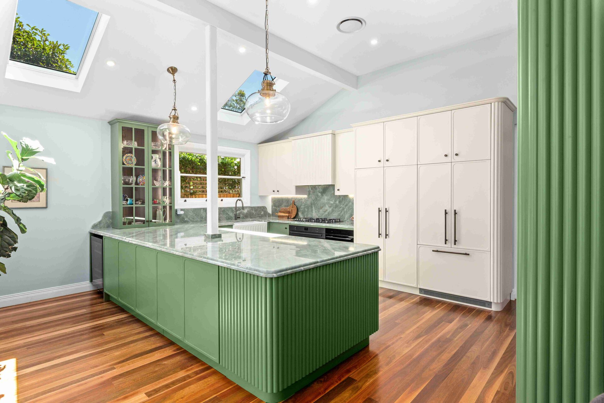 This bespoke kitchen features a custom shaker profile with a modern twist, softened through elegant curves and radius corners that subtly reinterpret a classic style. Designed to sit comfortably within a Federation home, the cabinetry balances heritage influence with contemporary execution.