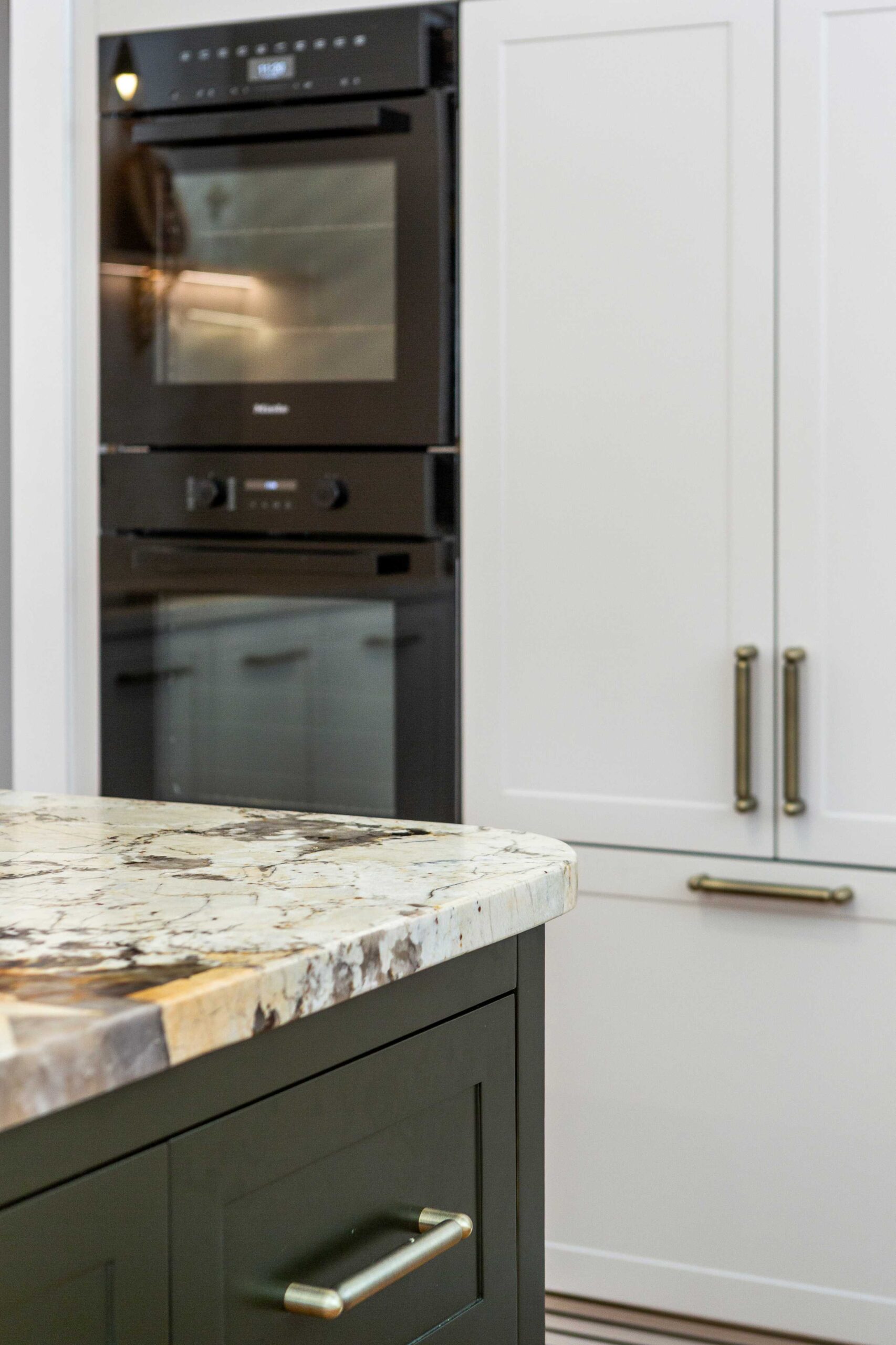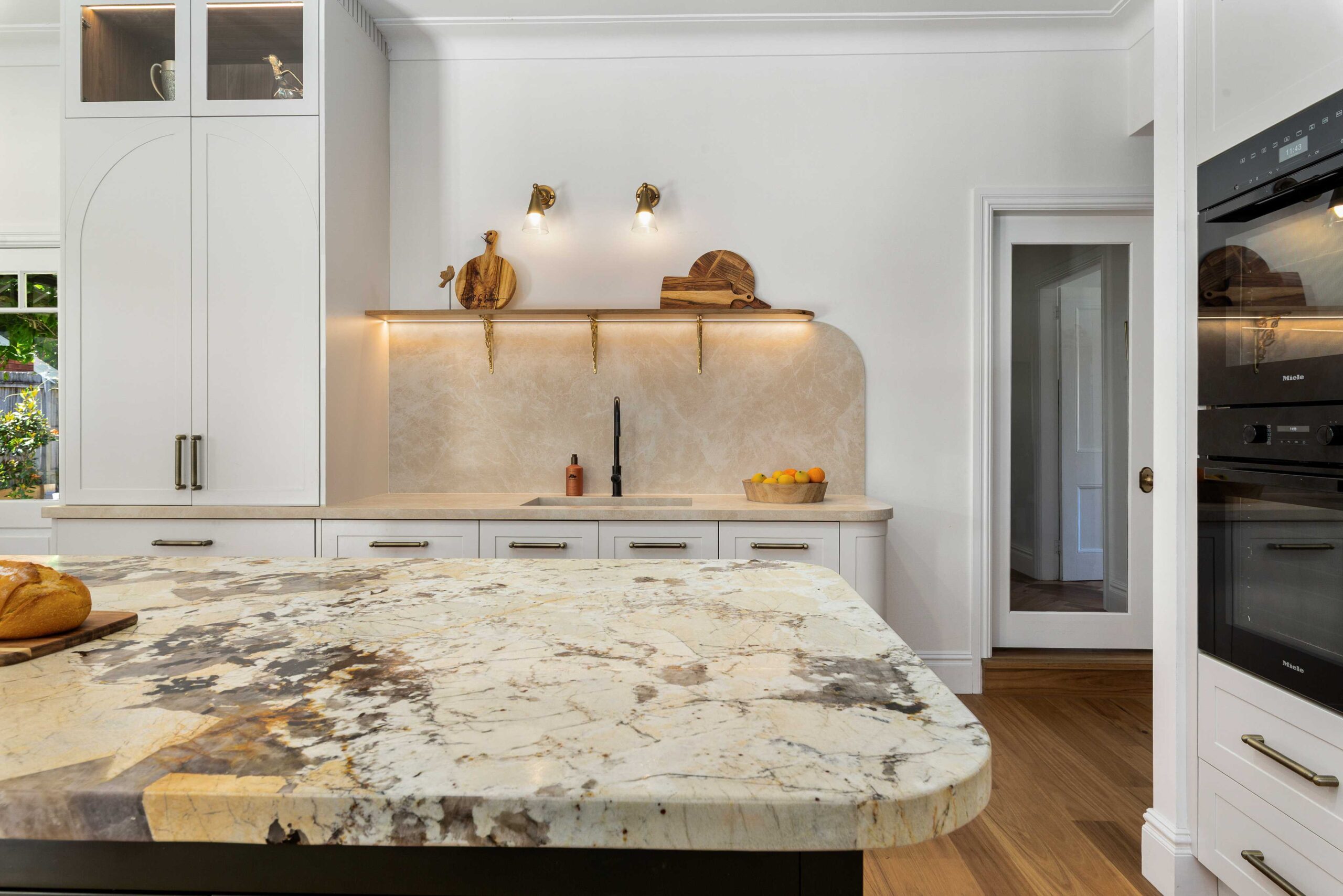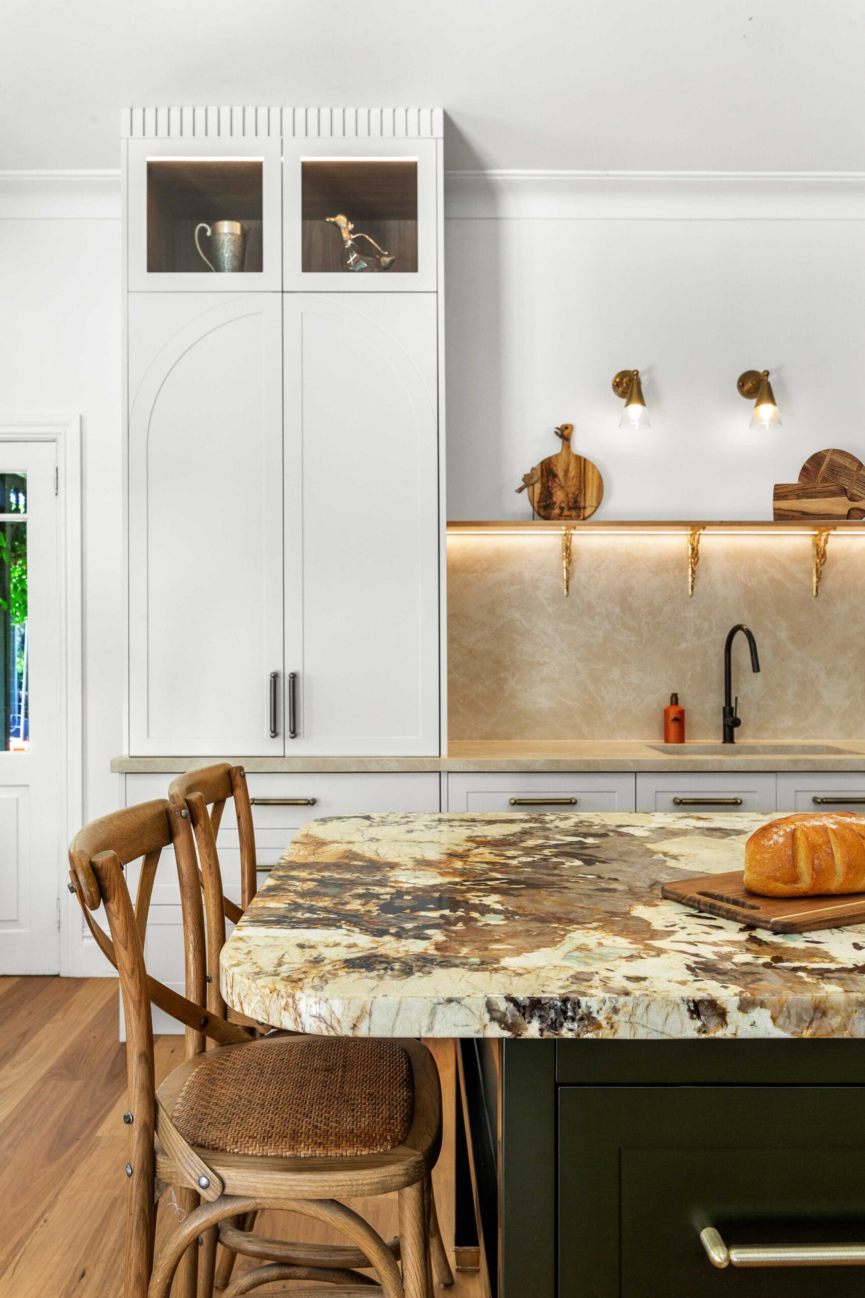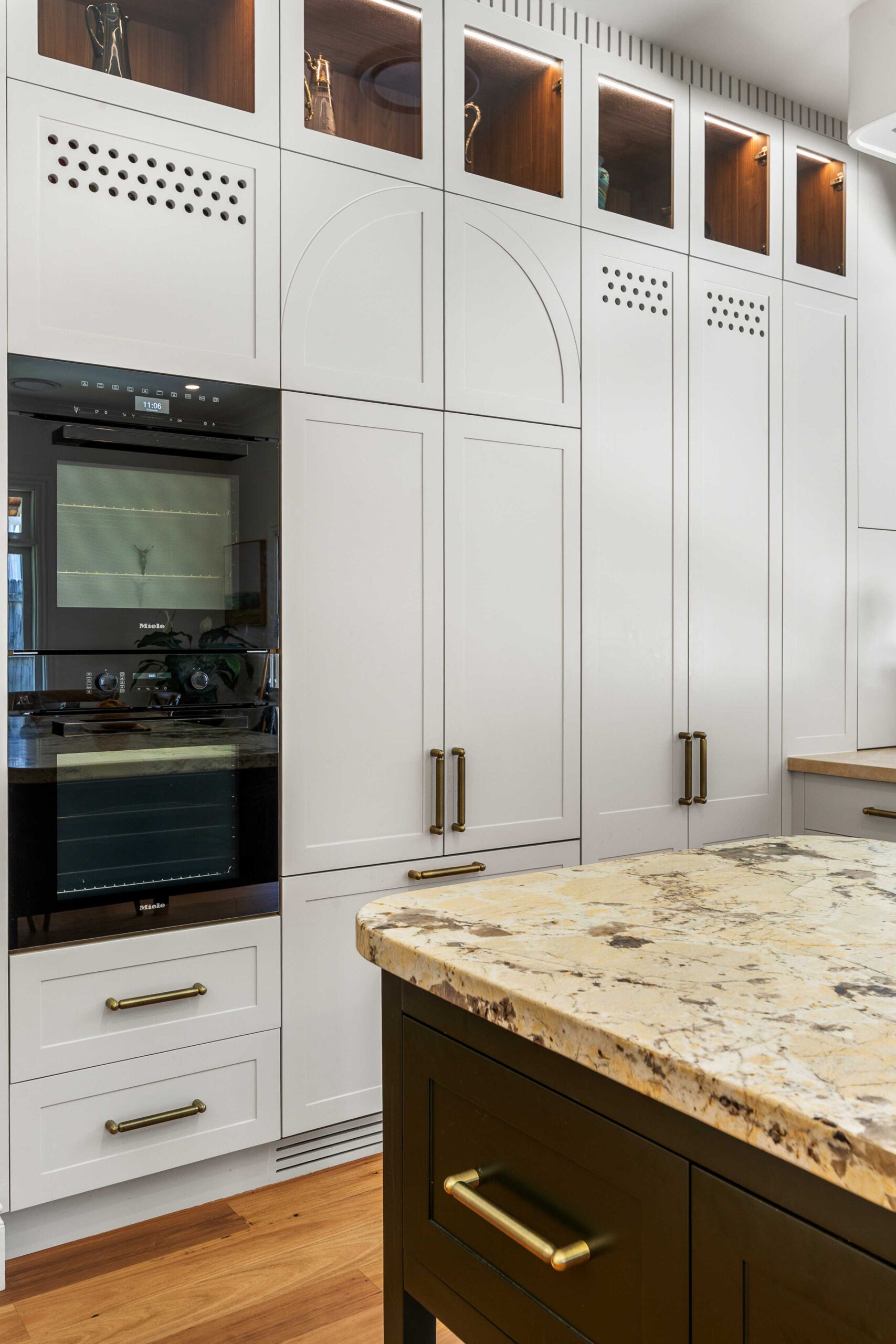 Finishing touches include Lo & Co Tubby Pull handles in Aged Brass, used consistently across the joinery to introduce warmth and a tactile elegance that complements the stone and cabinetry.