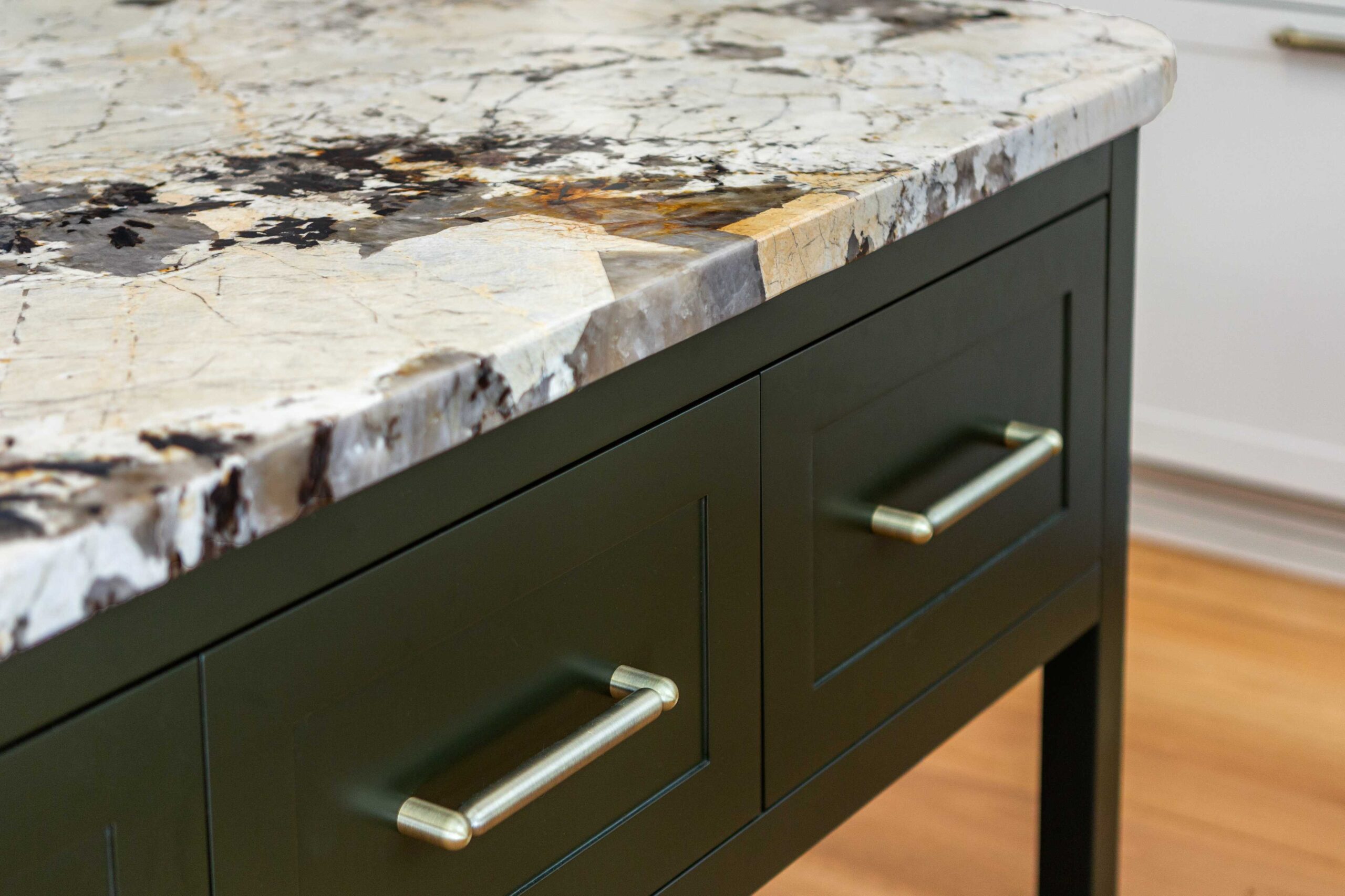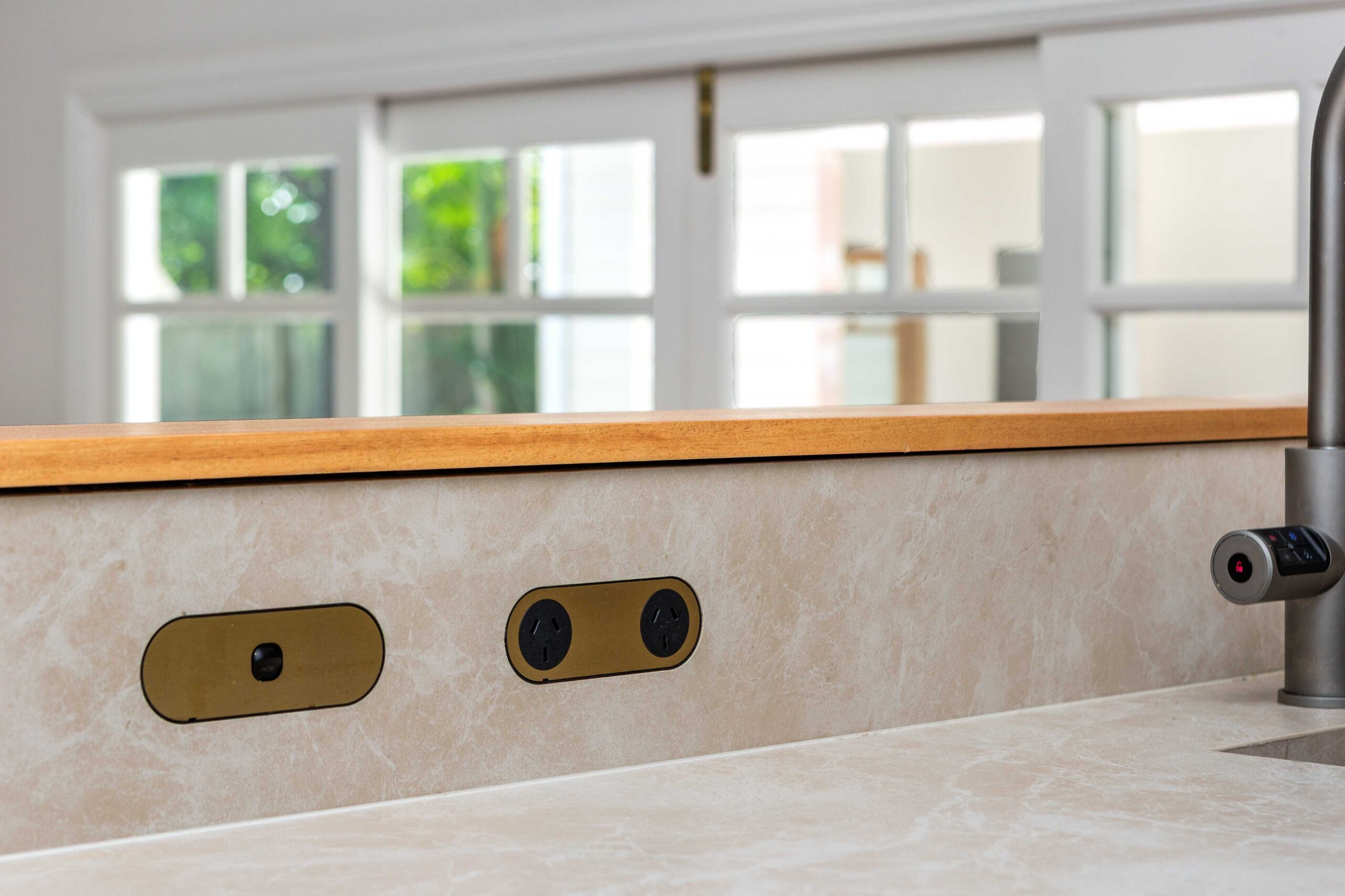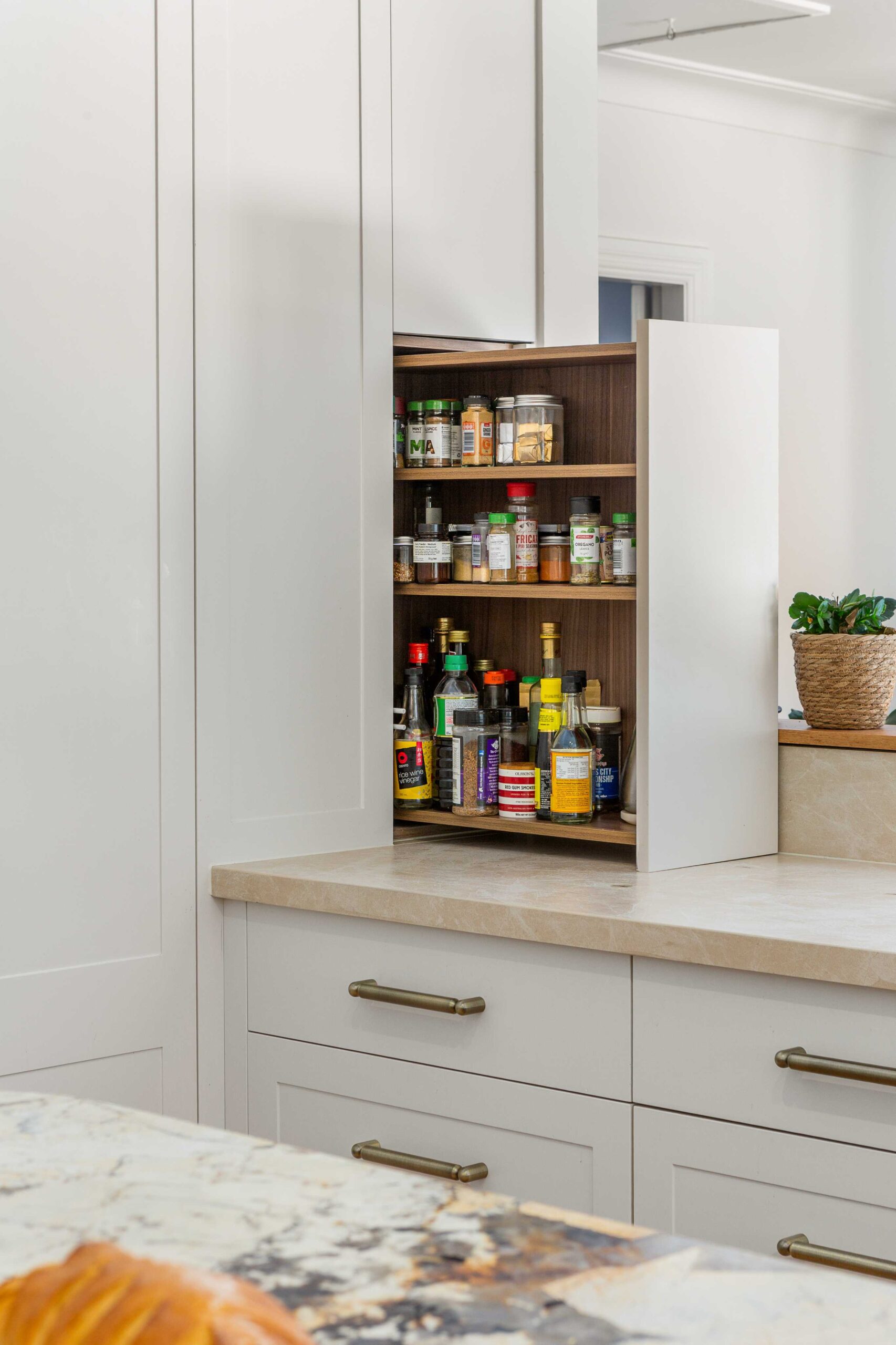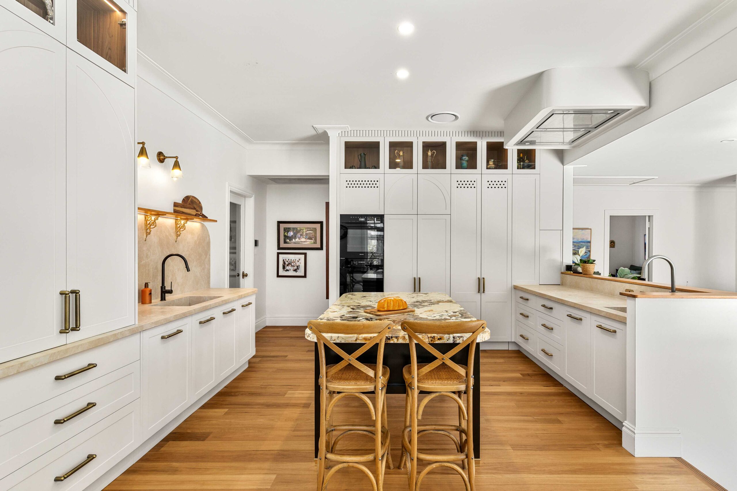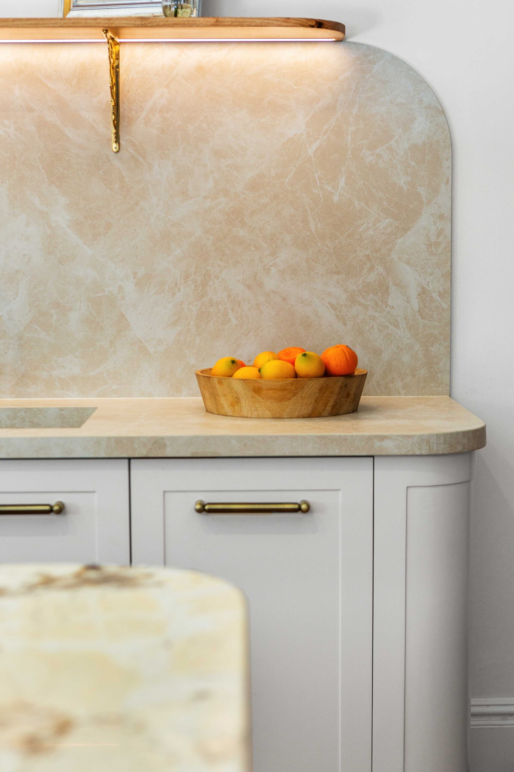 Finishing touches include Lo & Co Tubby Pull handles in Aged Brass, used consistently across the joinery to introduce warmth and a tactile elegance that complements the stone and cabinetry.