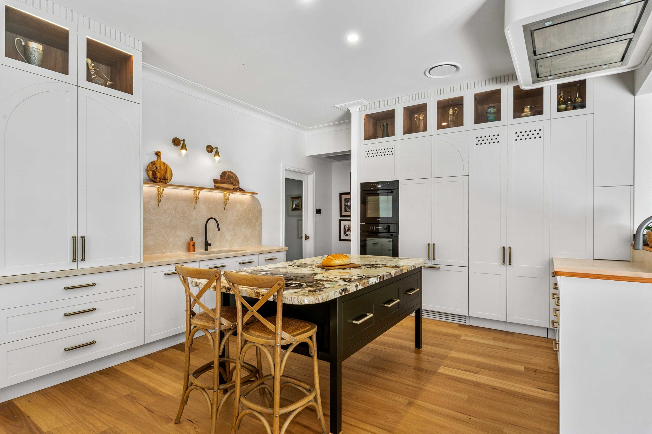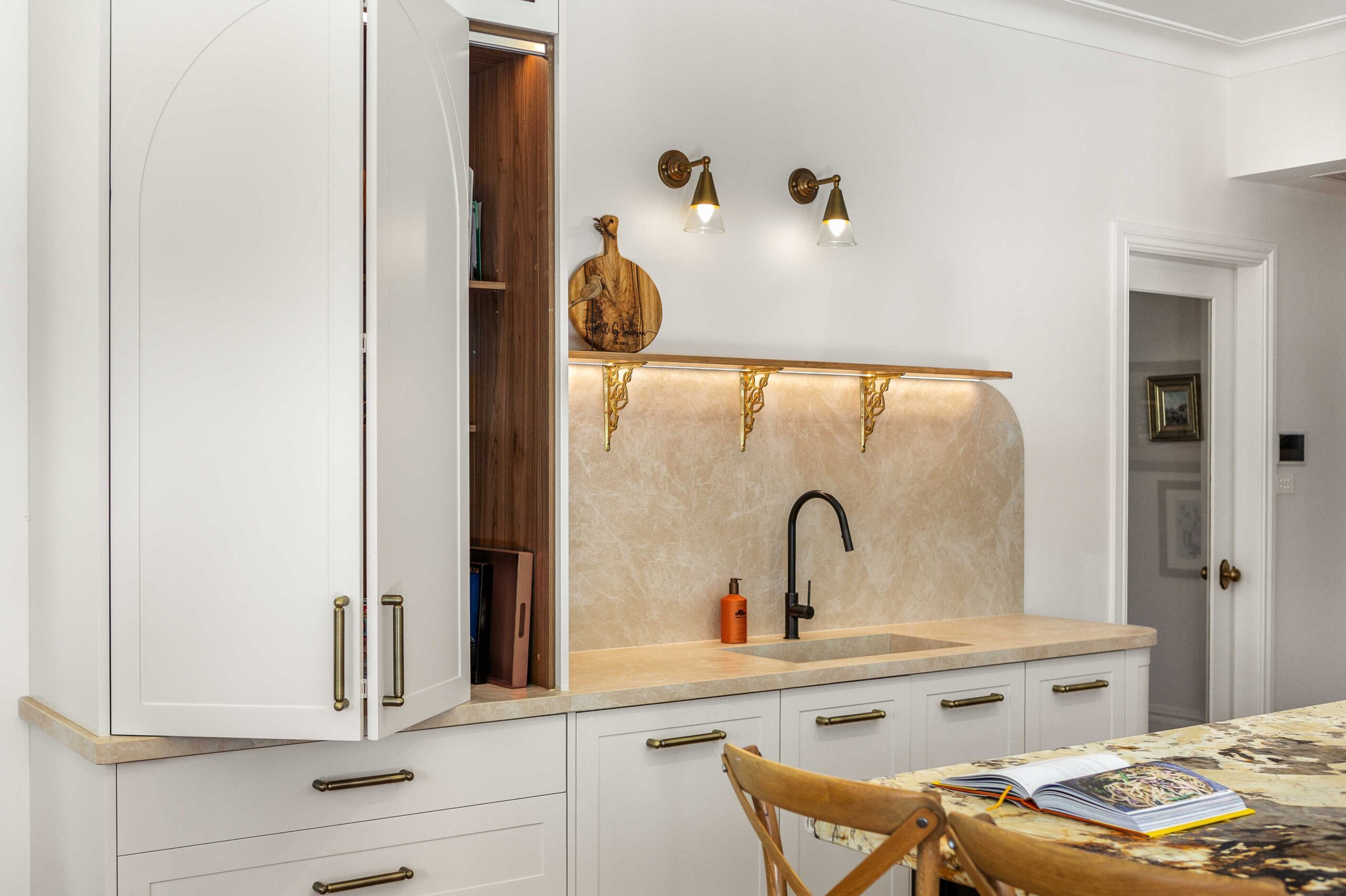 The joinery showcases our love of unique shaker profiles, with a custom-designed arched profile integrated into the tall cabinetry. This subtle architectural detail brings a point of difference to an otherwise classic space, drawing inspiration from timeless European kitchens.